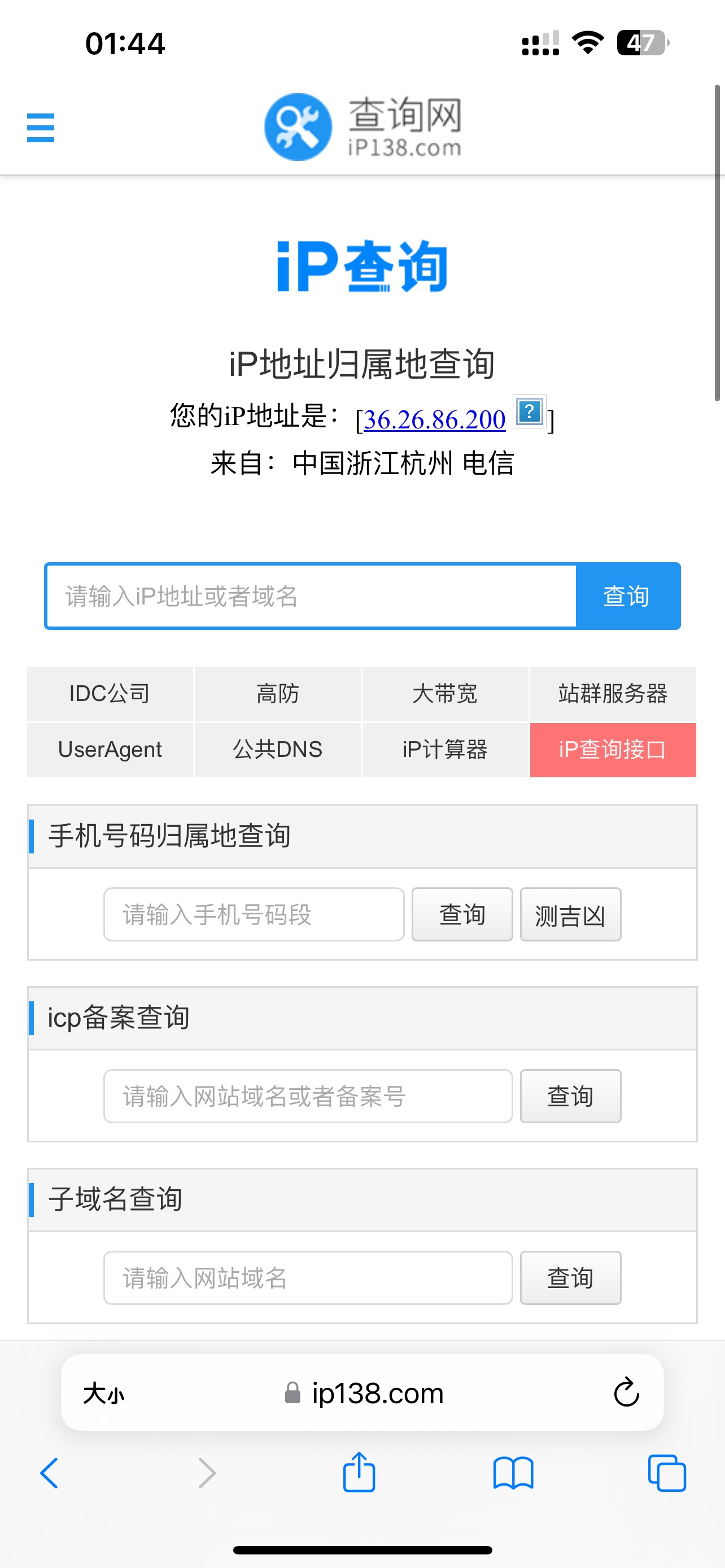 4.在浏览器中访问https://www.ip138.com,查询当前IP是否是您的代理IP,如果是说明代理设置成功